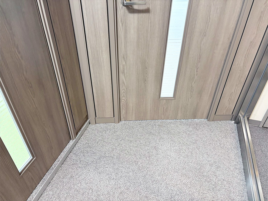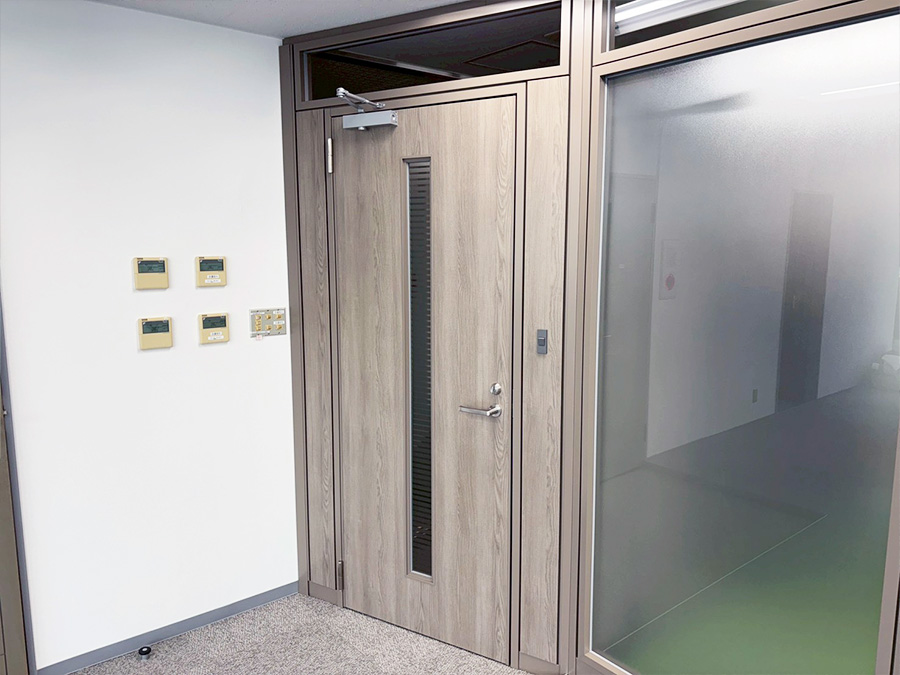 ・部屋の形状を生かして、閉鎖的にならない様に執務室と隣接するパーティションは、タペガラス仕様にし採光を取り入れて解放感を出しました。パーティション鋼板部分もグレー系木目にし、差別化しました。