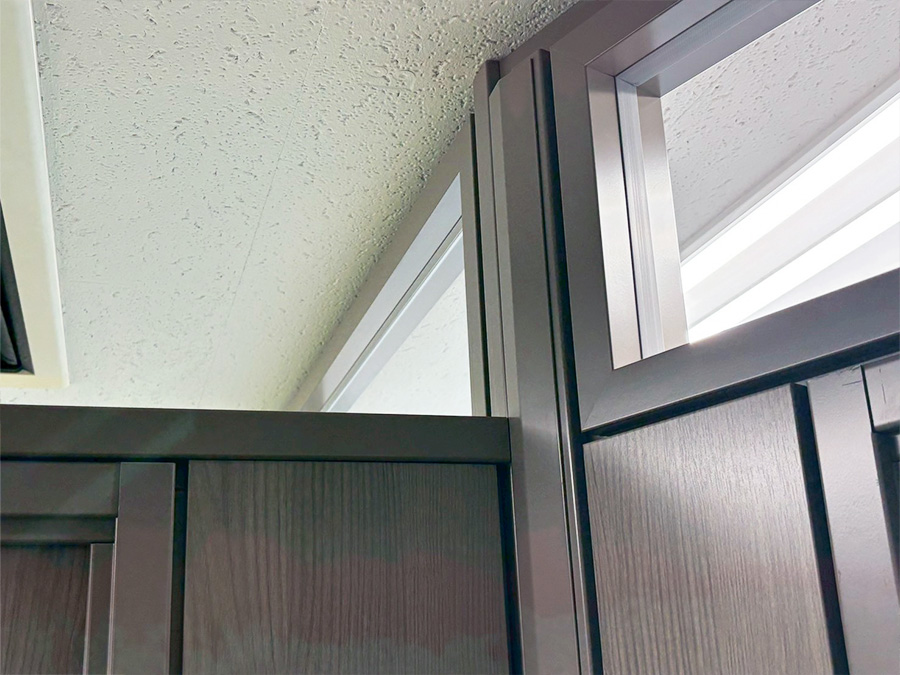 ・エントランスのランマ部分に関して、照明とエアコンが干渉する為、ロータイプ自立型間仕切にし、柱など無くスッキリ仕上げ、スイッチ位置の都合上、直線だけでなく角度を付けたドアパネル部分など拘りました。