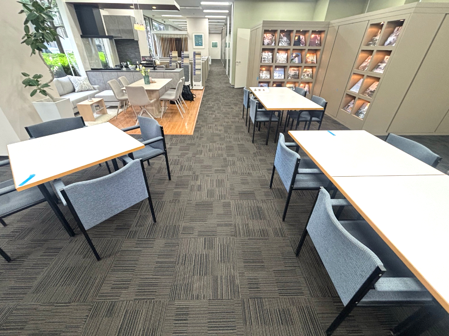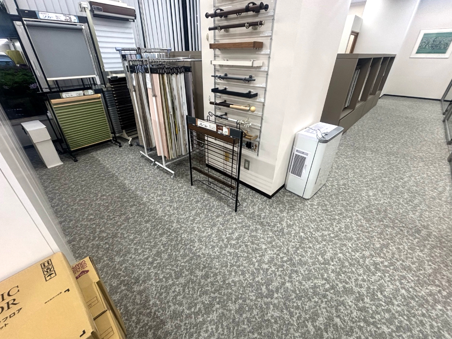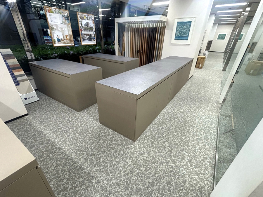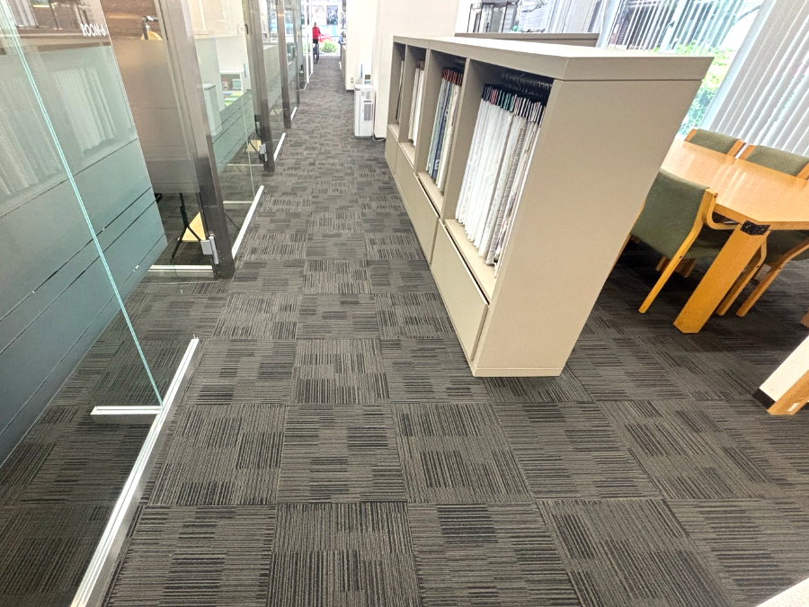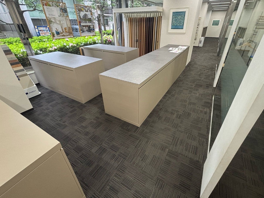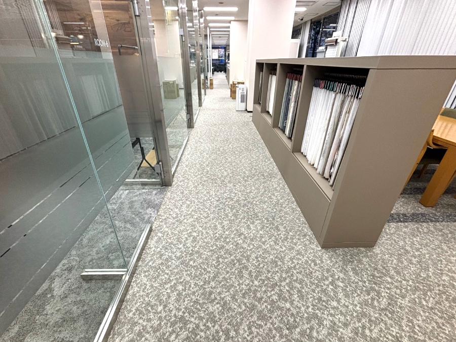 カラーサンプルを持参したお打合せの際にショールームの一部で造作家具などの移設の必要がありましたので、施工担当者も同席し、どこまでが移設可能かを確認。移設ができない部分は造作物の前まででタイルカーペットをカットして施工する旨をお打合せしました。