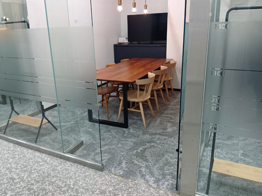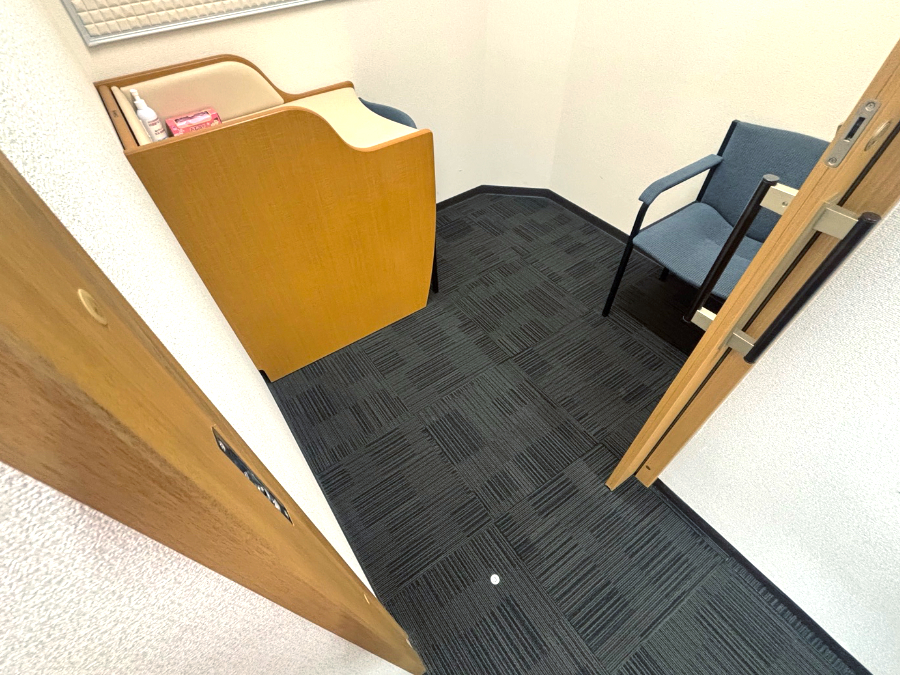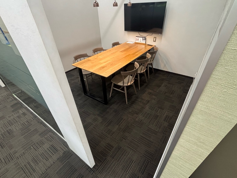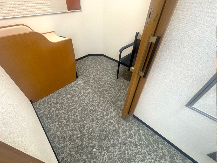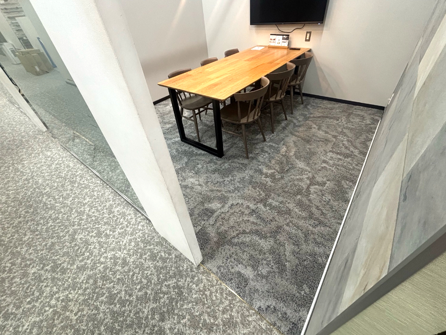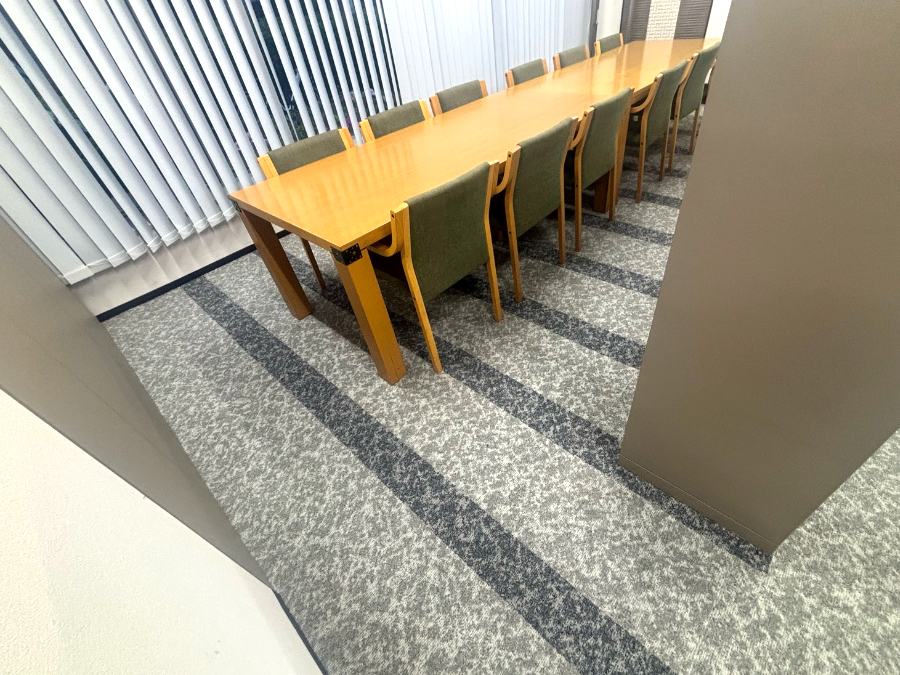 商談ルームにお選びいただきましたタイルカーペットは10mmと厚みがありました。既存のタイルカーペットとの厚み差で、ドアの開閉などの問題点もお話しし、見切り金具の施工位置の確認を行いました。結果、ご希望どおりの重厚感と洗練された空間となりました。