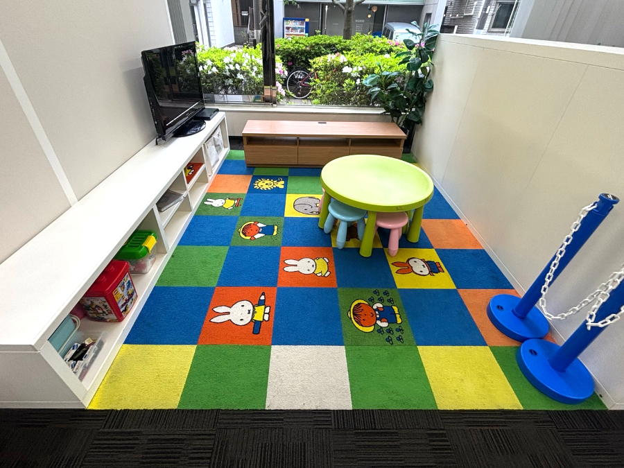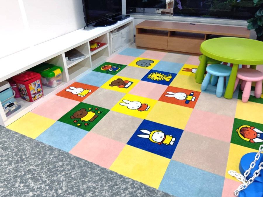 キッズスペースはお客様よりご指定のキャラクターがございましたので、周辺は併せて幅400mmのタイルカーペットを選定。カラーの貼りわけは弊社職人にお任せということでご指示いただき施工しました。