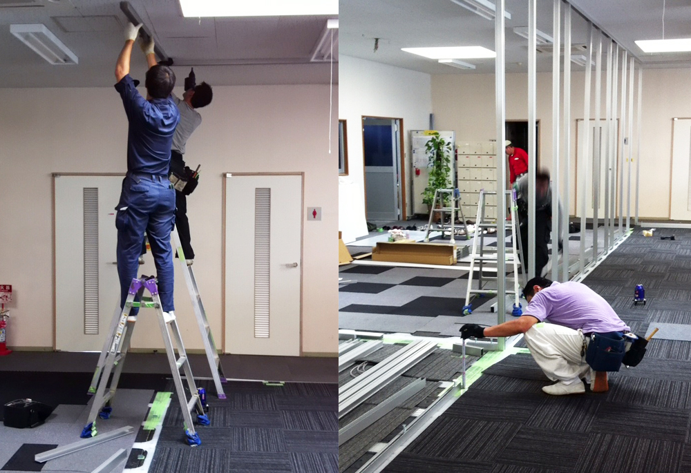 - パーティションが倒れないよう天井や床へビスを打ち込む振動音や、商品をビルにあわせてカットする際にかなりの高音がでます。建物によっては、土・日・祝日のみでの工事となる場合もあります。
